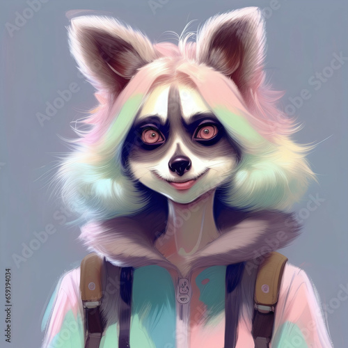 Portrait of a Anthropomorphic female raccoon. Digital illustration.