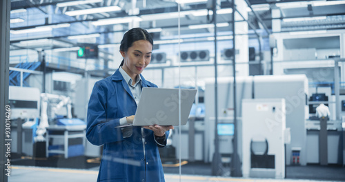 Portrait of a Beautiful Asian Engineer Using Laptop Computer and Looking Around a Factory Facility with Equipment Producing Modern Electronic Components with Robotic Arms on Assembly Conveyor