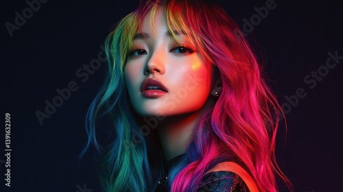 Portrait of a beautiful Asian woman with red hair in neon light, isolated on a black background.