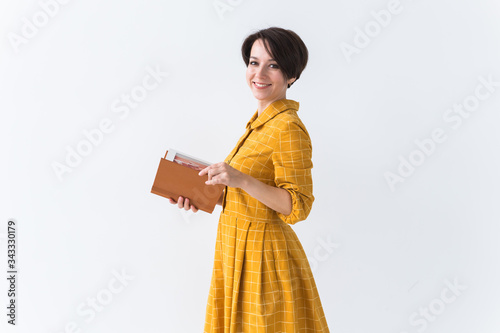 Portrait of a beautiful brunette girl in a yellow retro dress reading a book on white background. with copy space.