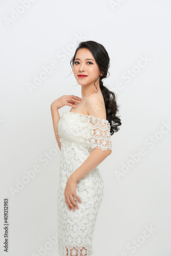 Portrait of a beautiful girl bride in a long lace dress with an elegant hairstyle.