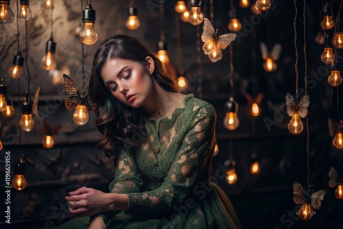 Portrait of a beautiful girl in a green dress among many suspended light bulbs and butterflies fluttering around her. Daydreaming. A magical atmosphere.