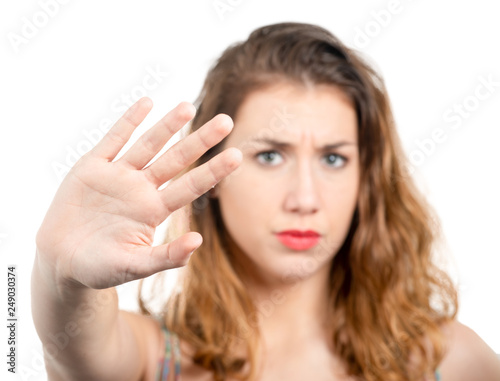 Portrait of a beautiful girl showing stop sign with palm isolated on white background