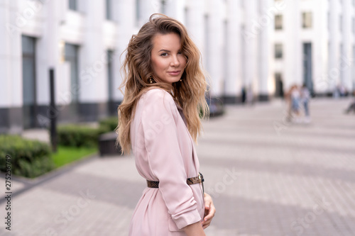 portrait of a beautiful girl with fluff hair on the street. Great mood. Pink jacket, great summer weather.