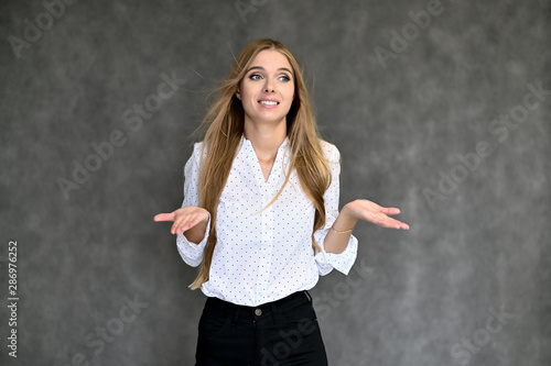 Portrait of a beautiful pretty girl student in a white shirt with long curly hair on a gray background. Beauty and brightness. Shows hands to the side, smiles with different emotions.