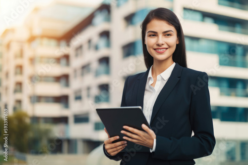 Portrait of a beautiful real estate agent in a stylish pantsuit, holding a tablet and smiling confidently with a modern cityscape in the background, generative ai
