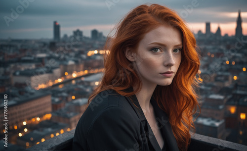 Portrait of a beautiful red-haired model, a ginger model with a face of beauty and red hair, noir, contrast, color paint, multiple colors, city at background , detailed,