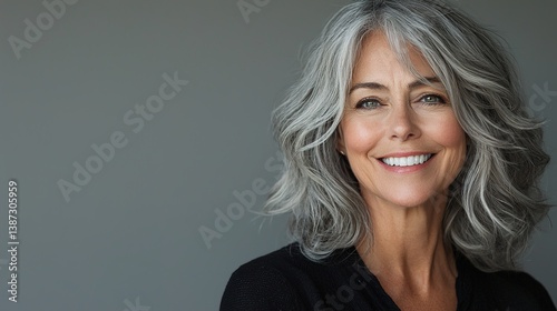 Portrait of a beautiful senior woman with gray hair, smiling against a gray background