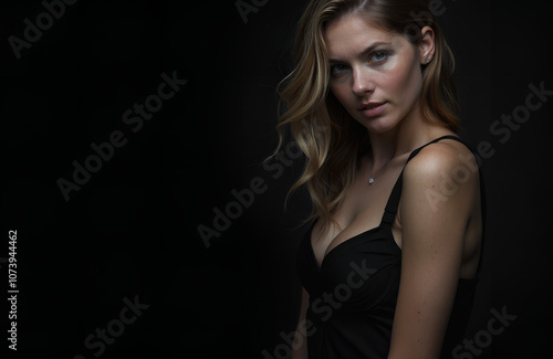 Portrait of a beautiful smiling young woman with long curly hair and a mysterious look on a dark background in a black evening dress