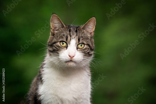 portrait of a beautiful tabby white cat outdoors in green nature looking at camera