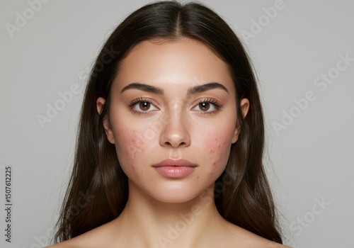 Portrait of a beautiful woman with clear skin, brown hair, and natural makeup, beauty face model