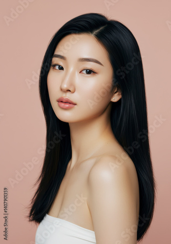Portrait of a Beautiful Young Asian Woman with Long Straight Black Hair and Smooth, Radiant Skin, Wearing a Simple White Top Against a Soft Pink
