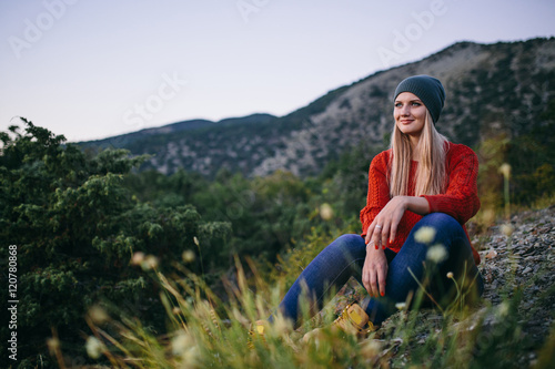 portrait of a beautiful young blonde woman in hat, red sweater, blue jeans sits outdoor on the background of mountain and forest. on the foreground blurred grass