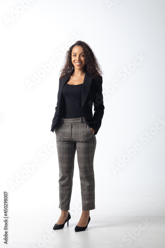 Portrait of a beautiful young hispanic woman smiling afro hairstyle isolated on white background