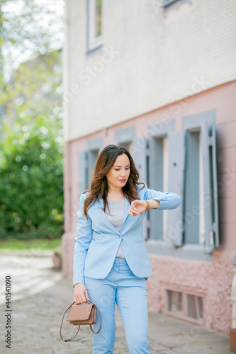 Portrait of a beautiful young woman in a blue suit with a bouquet of tulips. Spring.