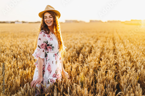Portrait of a beautiful young woman with curly hair and freckles face. Woman in dress and hat posing in wheat field at sunset and looking at camera