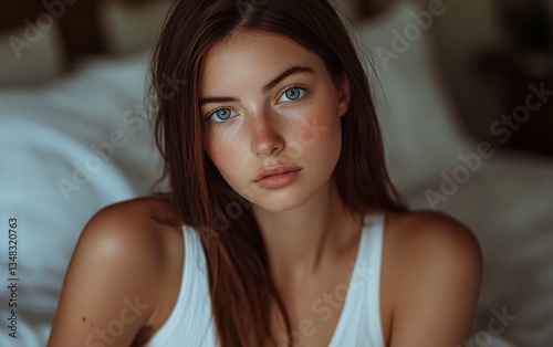 Portrait of a beautiful young woman with straight brown hair and blue eyes, wearing a white tank top and looking at the camera against a gray background in a bedroom. This image represents a lifestyle