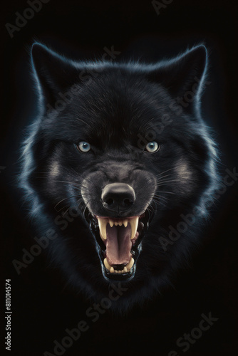 Portrait of a black fur wolf set against a black background. Looking straight at the camera. Soft blue glow rim lighting the animal figure. With a retro vintage sepia tint. Fierce animal.