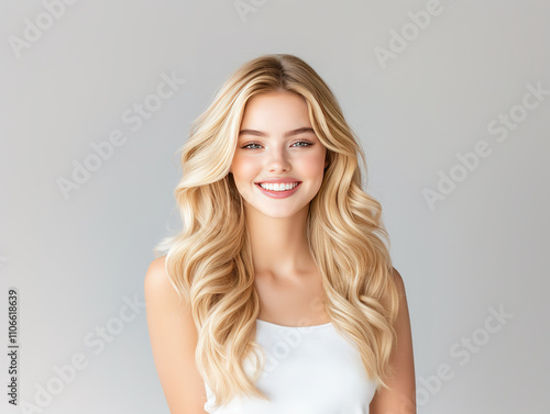 portrait of a blonde caucasian beauty model with trendy wavy medium-long hairstyle