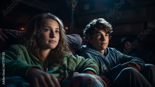 Portrait of a boy and girl watching a movie in the cinema. AI Generative