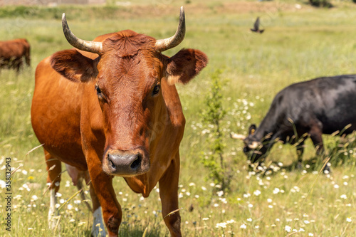Portrait of a brown cow bull with horns on a green meadow with white flowers. The head looks straight, the dark eyes open. Year of the bull 2021. Agriculture and livestock, dairy products.