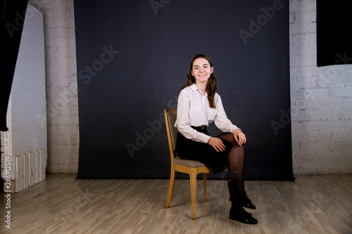 Portrait of a brunette girl with long hair sitting on a chair. Shooting in the studio, plain background.