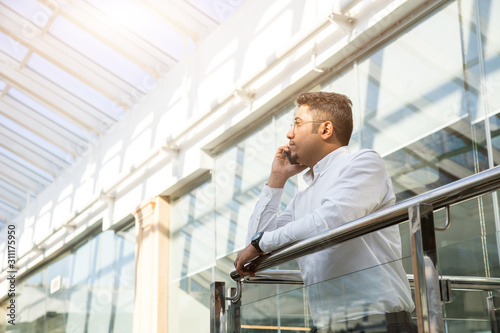 Portrait of a businessman in suit are standing on the background of glass offices.