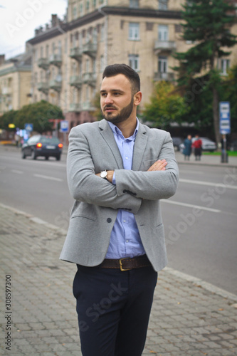 Portrait of a businessman on the street near the road of a European city. A bearded handsome man dressed stylishly. Fashionable guy hipster. Stock photos