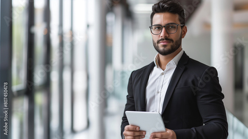 portrait of a businessman or a CEO holding a digital tablet standing in modern office, use of digital technology for business management