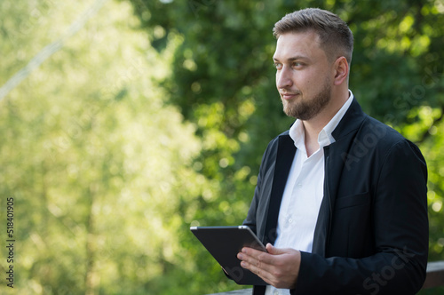 portrait of a businessman professional man with a tablet on a background of green leaves in a park garden forest