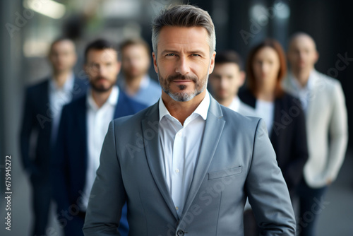 Portrait of a businessman standing in front of his team. Concept of teamwork, collaboration and excellent leader