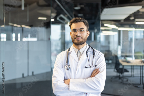 Portrait of a calm and serious doctor inside the office of a modern clinic. A man in a white medical coat and with a stethoscope with his arms crossed is looking at the camera.