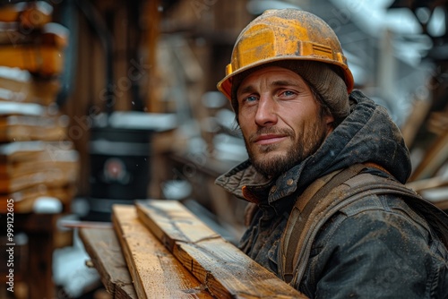 Portrait of a carpenter in work uniform carrying wooden planks for home renovation project