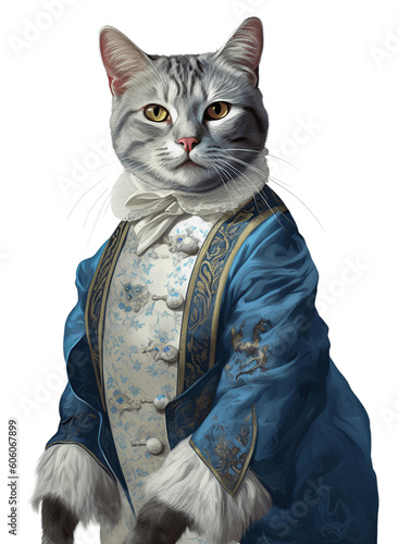 Portrait of a cat dressed up in elegant clothes and standing in a blue suit, generative AI