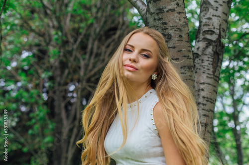 Portrait of a charming blond woman wearing beautiful white dress standing next to rowan tree.