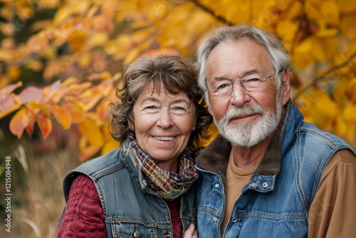 Portrait of a cheerful couple in their 50s wearing a rugged jean vest over background of autumn leaves