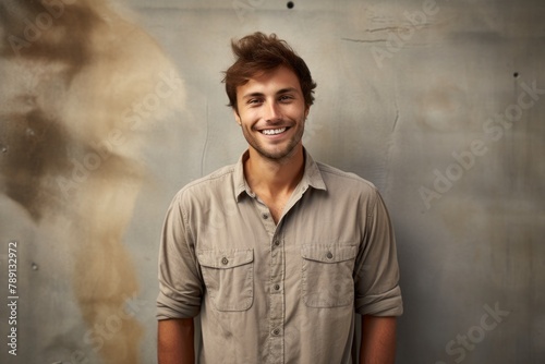 Portrait of a cheerful man in his 20s sporting a breathable hiking shirt on bare concrete or plaster wall