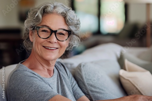 Portrait of a cheerful senior woman with stylish glasses and grey hair, smiling warmly while relaxing on a cozy sofa in a well-lit, comfortable living room setting