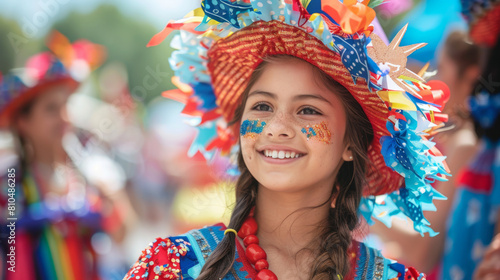 Portrait of a cheerful young girl dressed in colorful traditional Junina festival attire, enjoying the celebration.