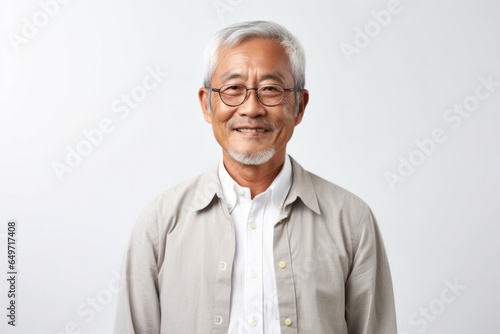 portrait of a confident Filipino man in his 60s wearing a chic cardigan against a white background