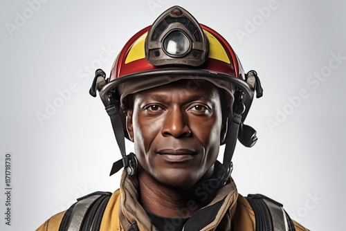 Portrait of a confident firefighter wearing protective gear, displaying determination and strength.