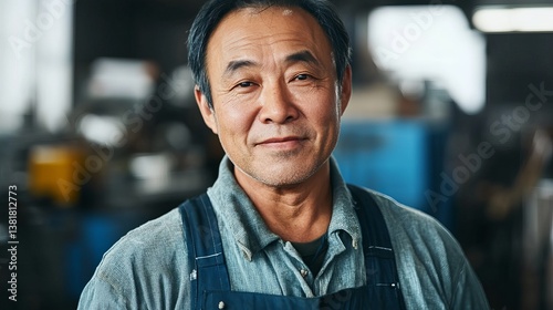 Portrait of a Confident Mature Asian Male Worker in a Factory Setting Hardworking Skilled Professional Industrial Employee Serious Expression Blue