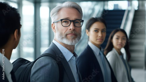 Portrait of a confident mature businessman leading a diverse team of professionals in a modern office building, showcasing leadership and teamwork