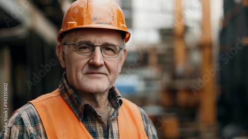Portrait of a confident mature old facility manager man wearing glasses, a safety helmet and vest in a modern workspace
