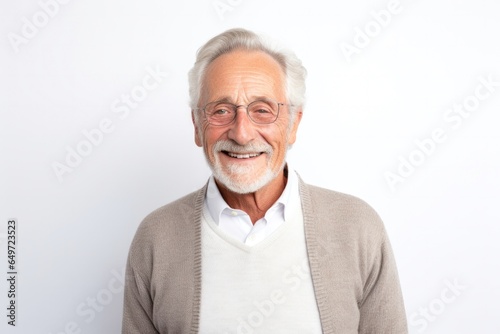 Portrait of a confident Polish man in his 70s wearing a chic cardigan against a white background