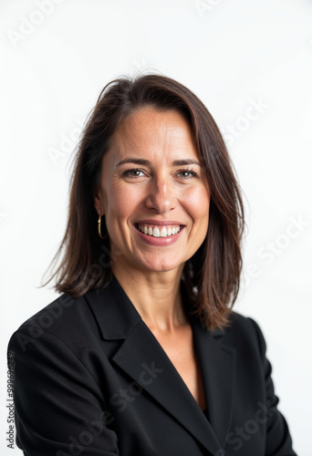 Portrait of a confident, professional woman in formal attire with a warm, approachable smile.