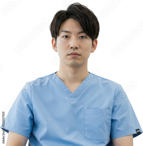 Portrait of a Confident Young Asian Male Doctor or Nurse in Light Blue Medical Scrubs