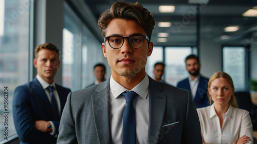 Portrait of a confident Young businessman standing in an office with his colleagues in the background