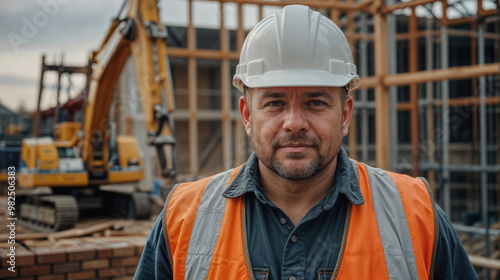 portrait of a construction worker wearing white helmet and reflective vest with bulldozer in the background