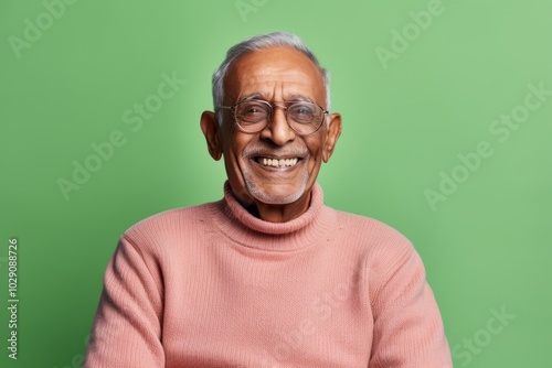 Portrait of a content indian elderly man in his 90s wearing a cozy sweater in pastel green background
